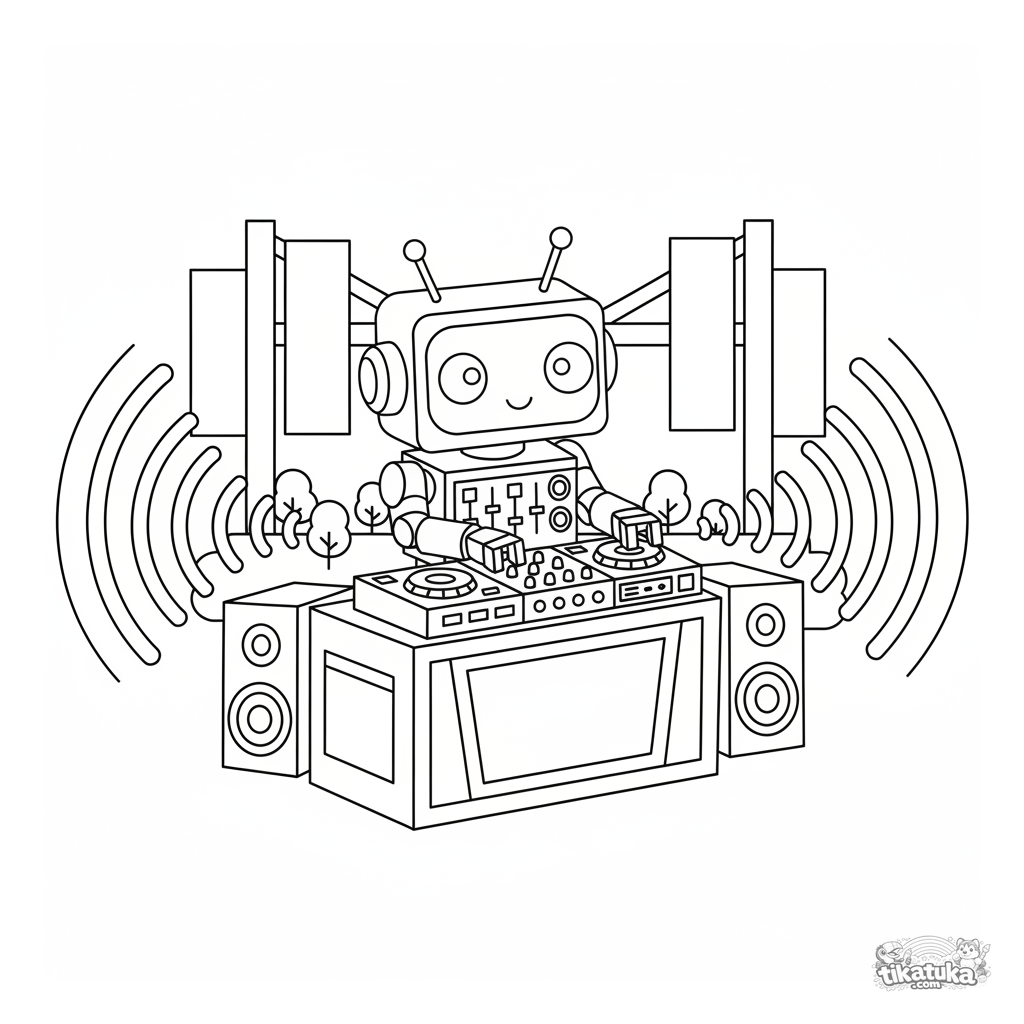 Раскраска в стиле бумажной аппликации: робот-DJ за пультом на фестивальной сцене. Современная сцена с волнами звука, простая для раскрашивания.