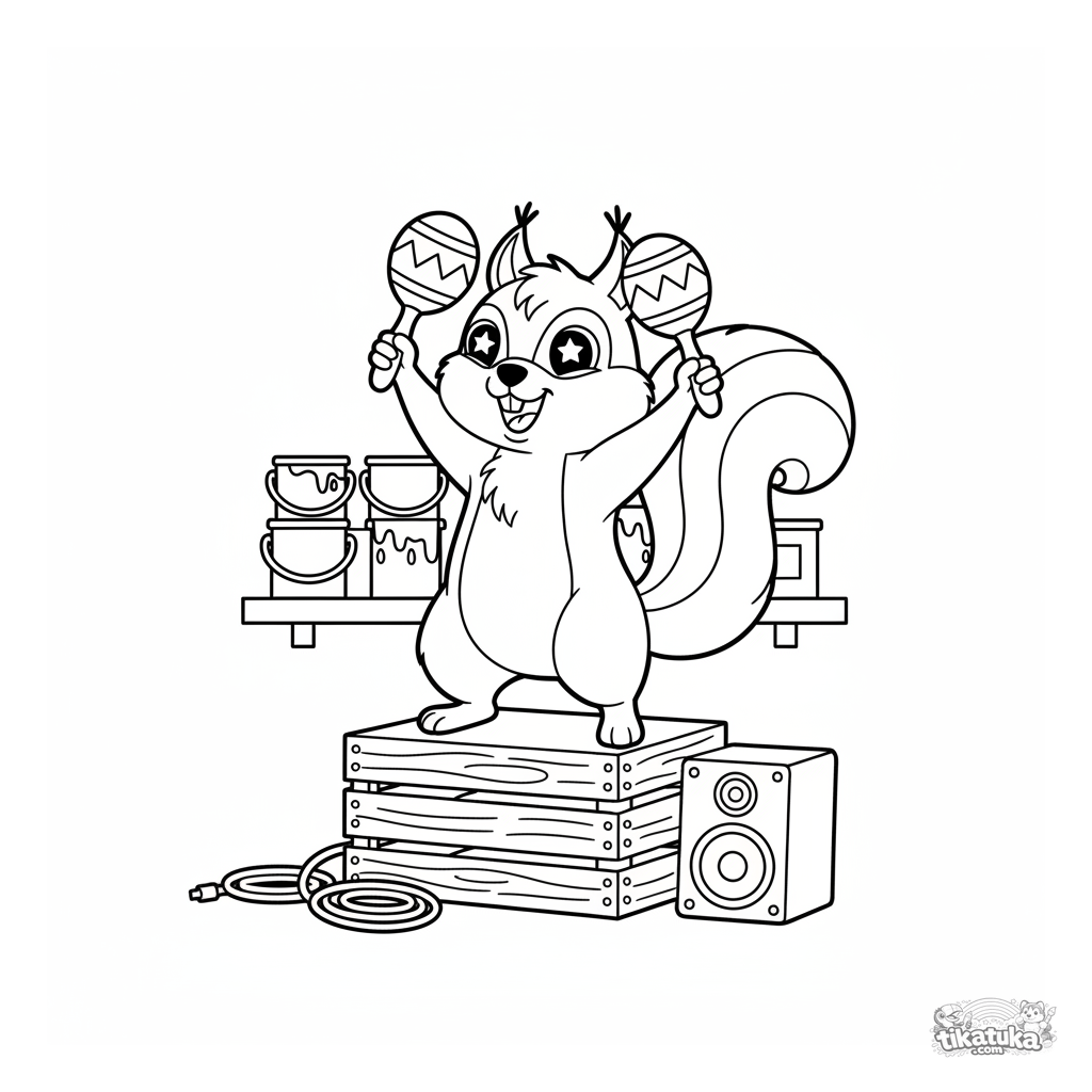 Раскраска для детей: энергичная белка трясёт маракасами в гараже. Динамичная сцена в стиле бумажной аппликации. Для печати и раскрашивания.