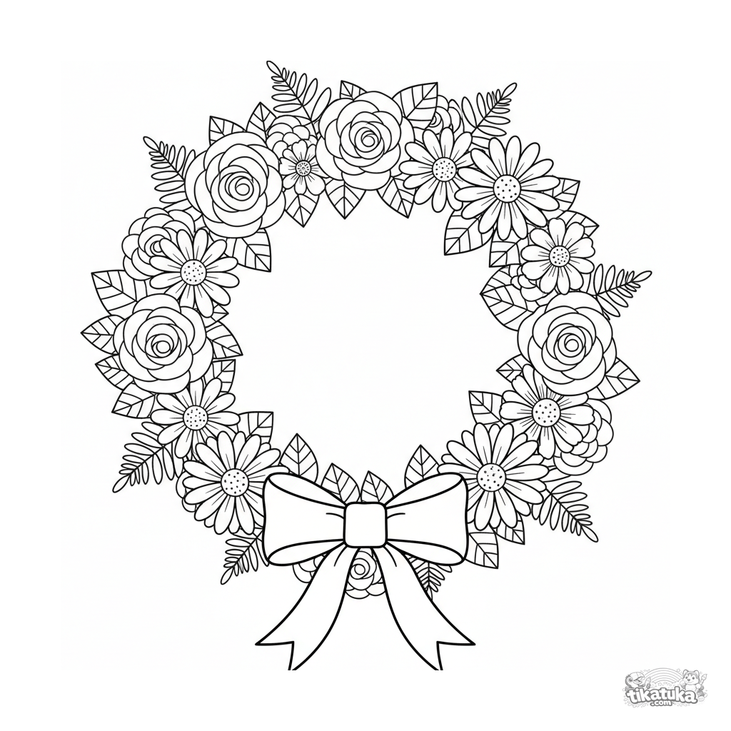 Раскраска для школьников: декоративный цветочный венок в стиле бумажной вырезки с лентой. Симметричный дизайн, четкие контуры, умеренная детализация.