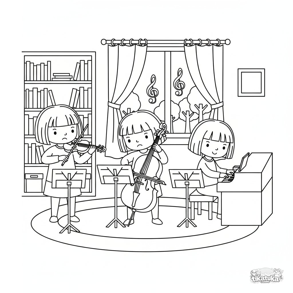 Раскраска для детей 5-8 лет: трио музыкантов в стиле бумажной аппликации играет в уютном классе. Чёткие контуры, узнаваемые инструменты.