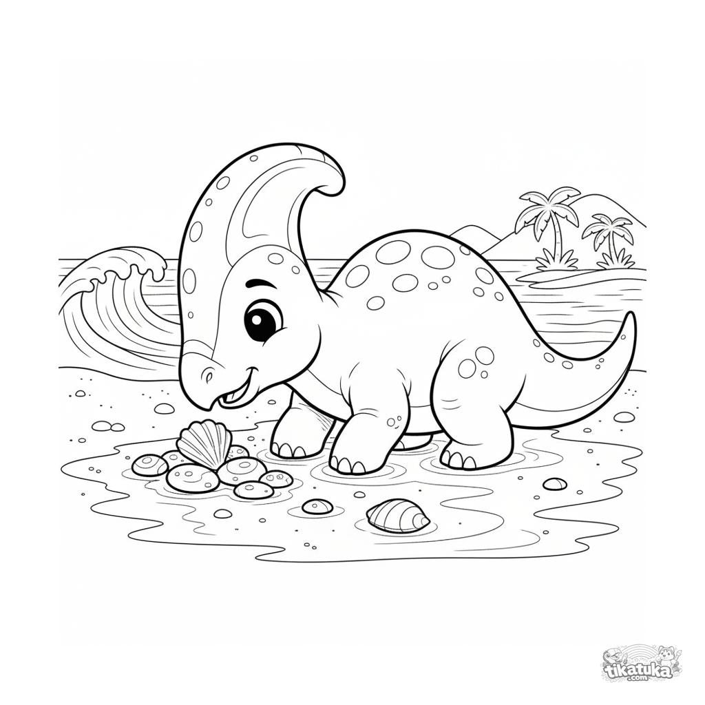Раскраска для детей 4-6 лет: паразауролоф исследует песчаный пляж древнего океана, играя у кромки воды. Динозавр в полный рост с широкими белыми полями.