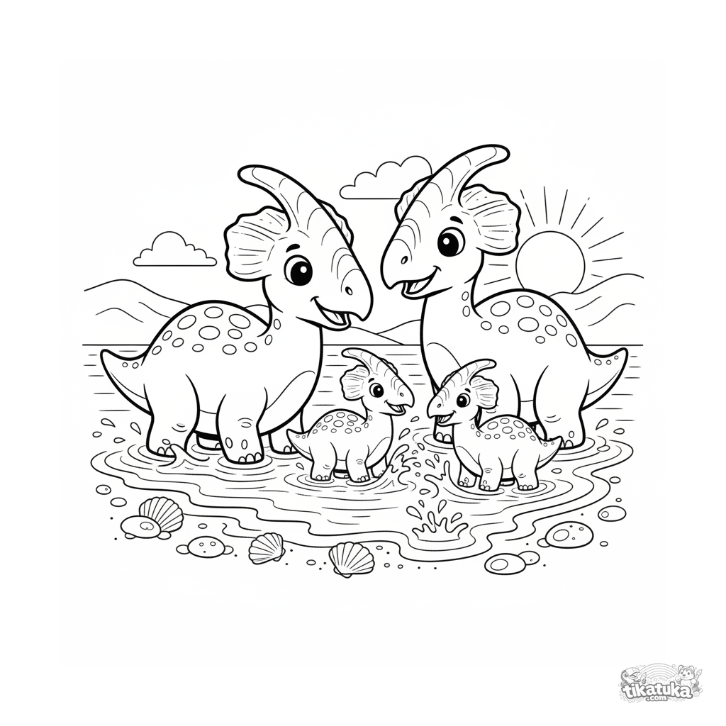 Раскраска для детей 4-6 лет: семья динозавров паразауролофов на песчаном пляже древнего океана. Милая семейная сцена для раскрашивания.