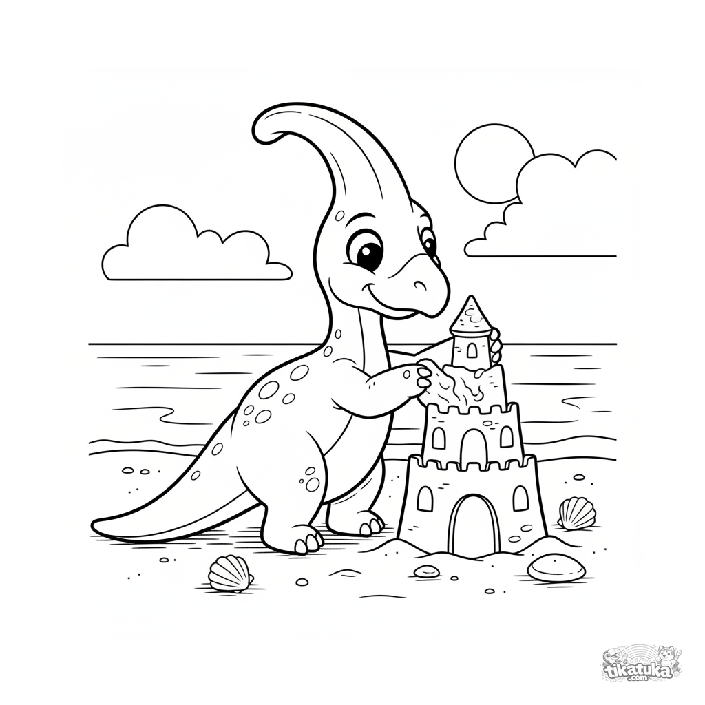 Раскраска для детей 4-6 лет: любознательный паразауролоф строит песчаный замок на берегу древнего океана. Милая и простая сцена для творчества.