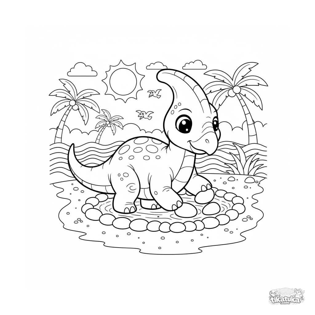 Раскраска для детей 4-6 лет: паразауролоф обустраивает гнездо из камней на песчаном пляже древнего океана. Детская раскраска с динозавром.