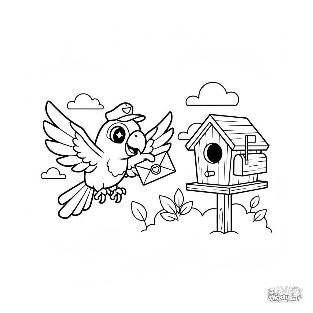 Раскраска для детей 4-6 лет: весёлый попугай в почтальонской фуражке летит с письмом к деревянному скворечнику. Стиль мультфильмов 80-х, динамичная поза, простые формы.