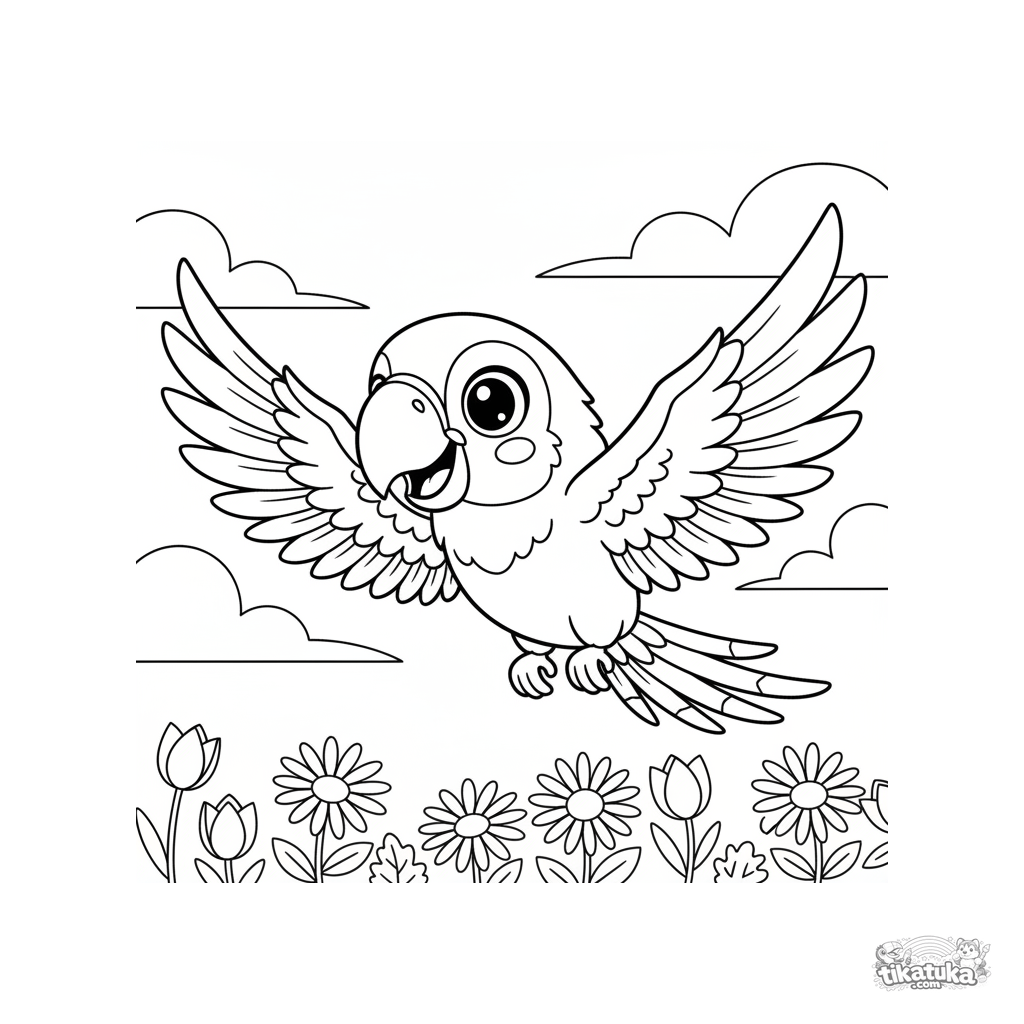Раскраска для детей: веселый попугай летит над весенним лугом. Стиль чиби с большой головой и выразительными глазами, динамичная поза.