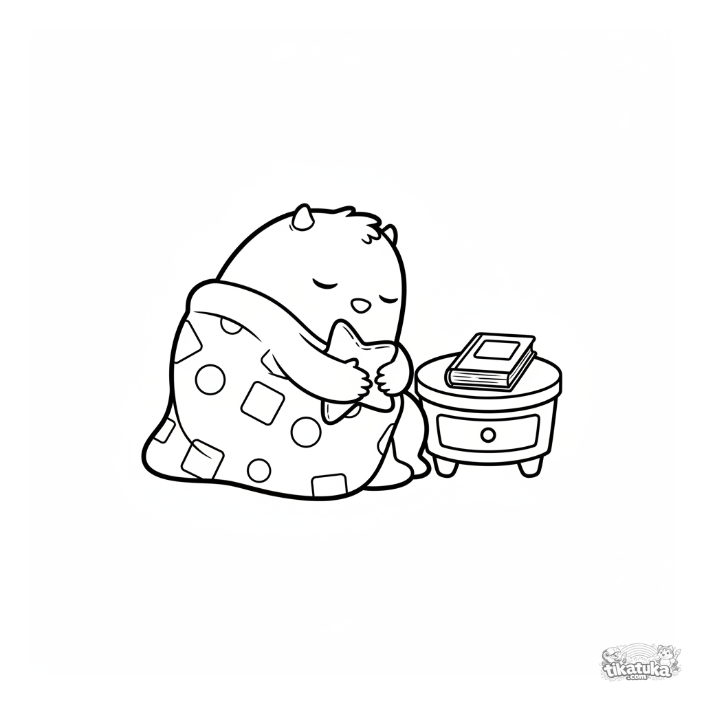 Простая раскраска для малышей 2-3 лет: грушевидный монстр крепко спит, обняв игрушку, в уютной комнате. Крупные, понятные формы для первых уроков раскрашивания.