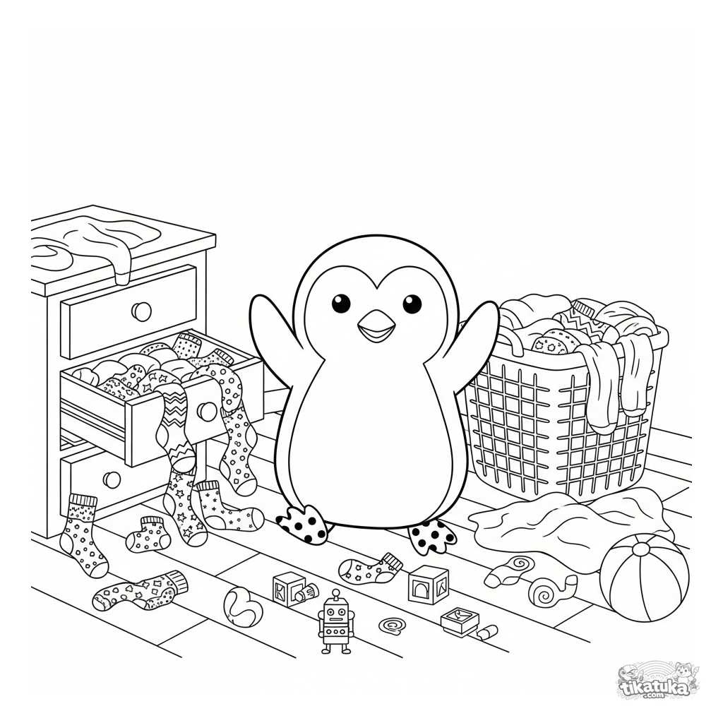 Раскраска для детей 7-12 лет: радостный пингвин празднует победу в непарных носках посреди комнаты с разбросанным бельем. Смешная и узнаваемая сцена.
