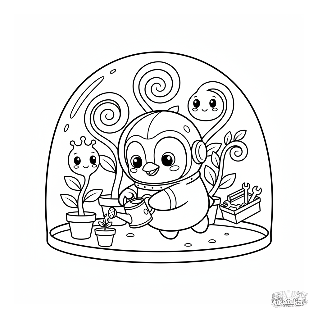 Раскраска для детей 4-8 лет: пингвин-шеф Марсель в скафандре ухаживает за инопланетными растениями в космической оранжерее. Милая сцена для творчества.