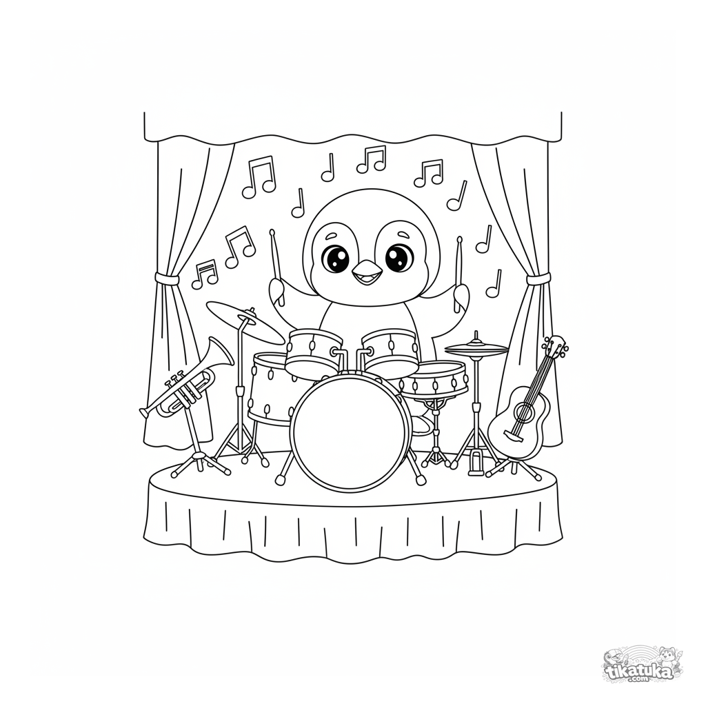 Раскраска для детей 4-6 лет: пингвин Марсель играет на ударной установке на сцене маленькой группы. Выразительная сцена в стиле мягкой куклы.