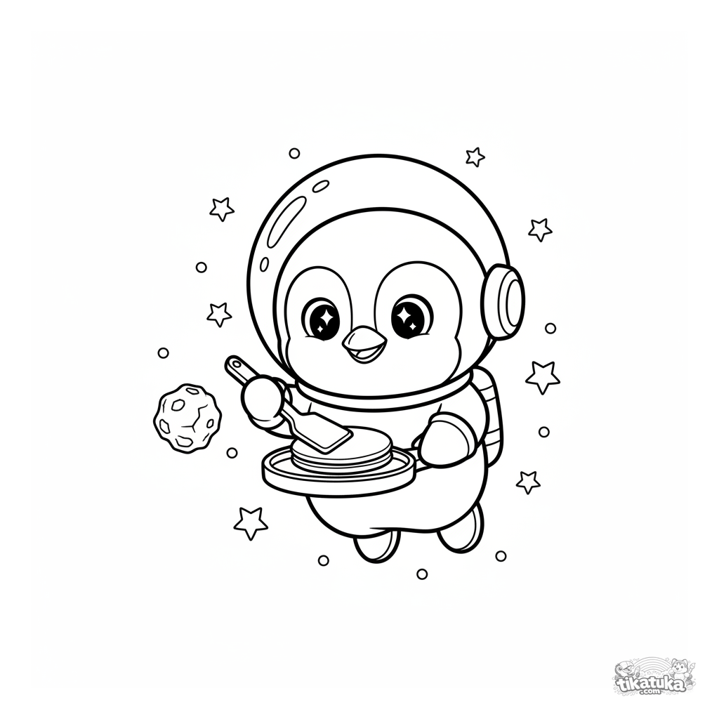 Раскраска: пингвин-шеф Марсель готовит в открытом космосе. Для детей 4-6 лет. Забавная сцена в стиле плюшевого талисмана.