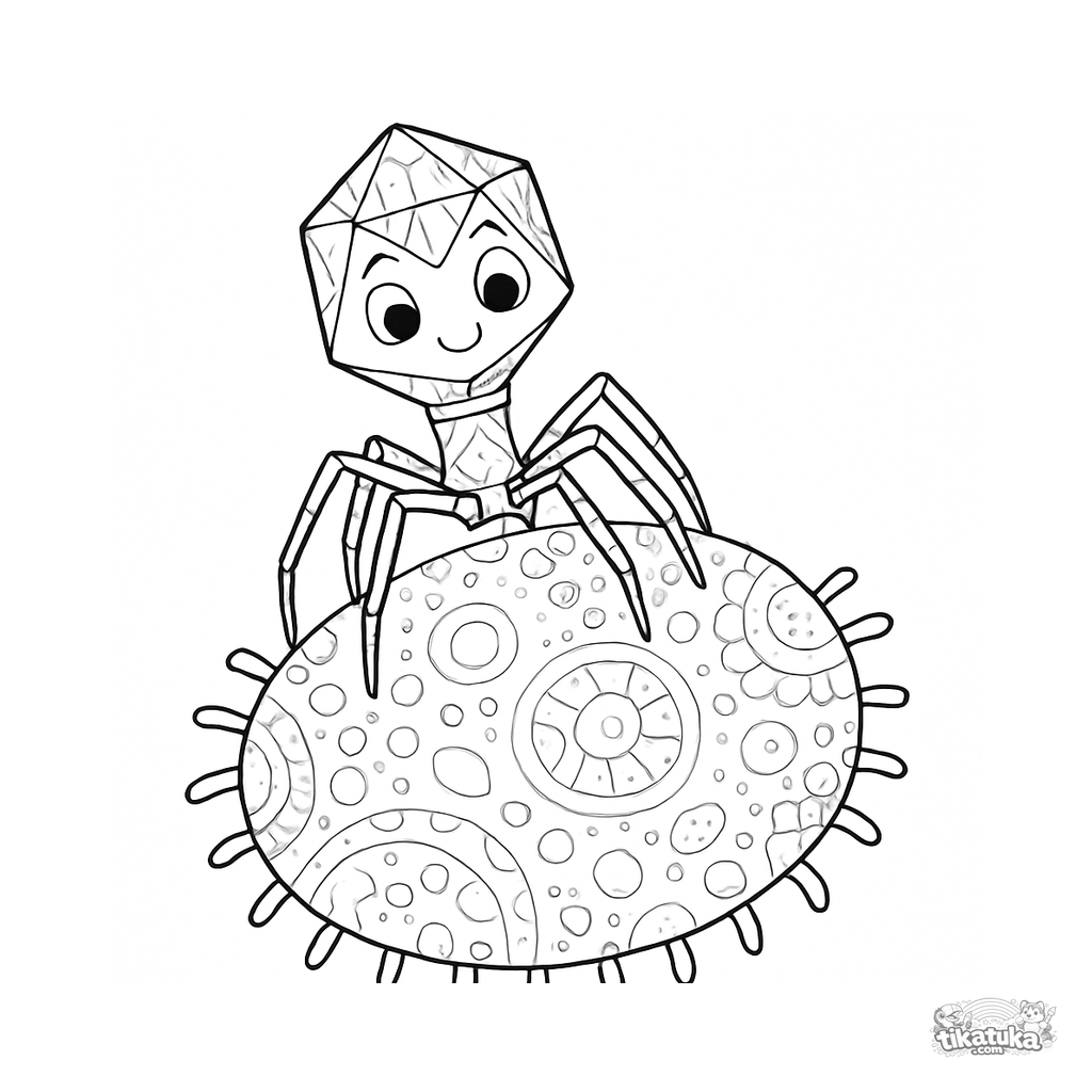 Раскраска для детей 8-12 лет. Детальный бактериофаг с геометрической головкой и ножками-лапками приземляется на круглую бактерию. Скачать бесплатно.