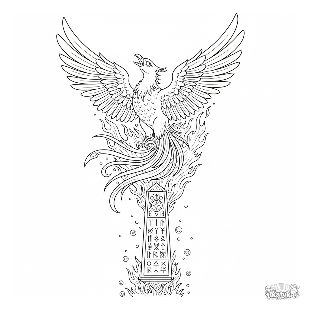 Сложная раскраска для детей 10-12 лет: величественный феникс восстает из древнего рунного обелиска в вихре стилизованного пламени. Детальная проработка перьев и резьбы.