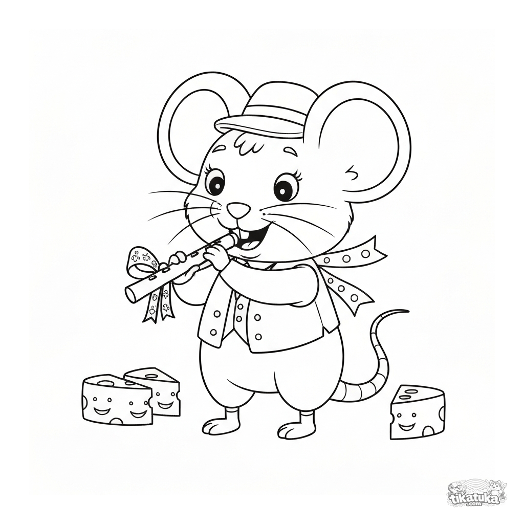 Раскраска для малышей: мышонок-крысолов весело играет на флейте, а за ним следуют кусочки сыра. Забавная и простая сцена для детей 2-5 лет.