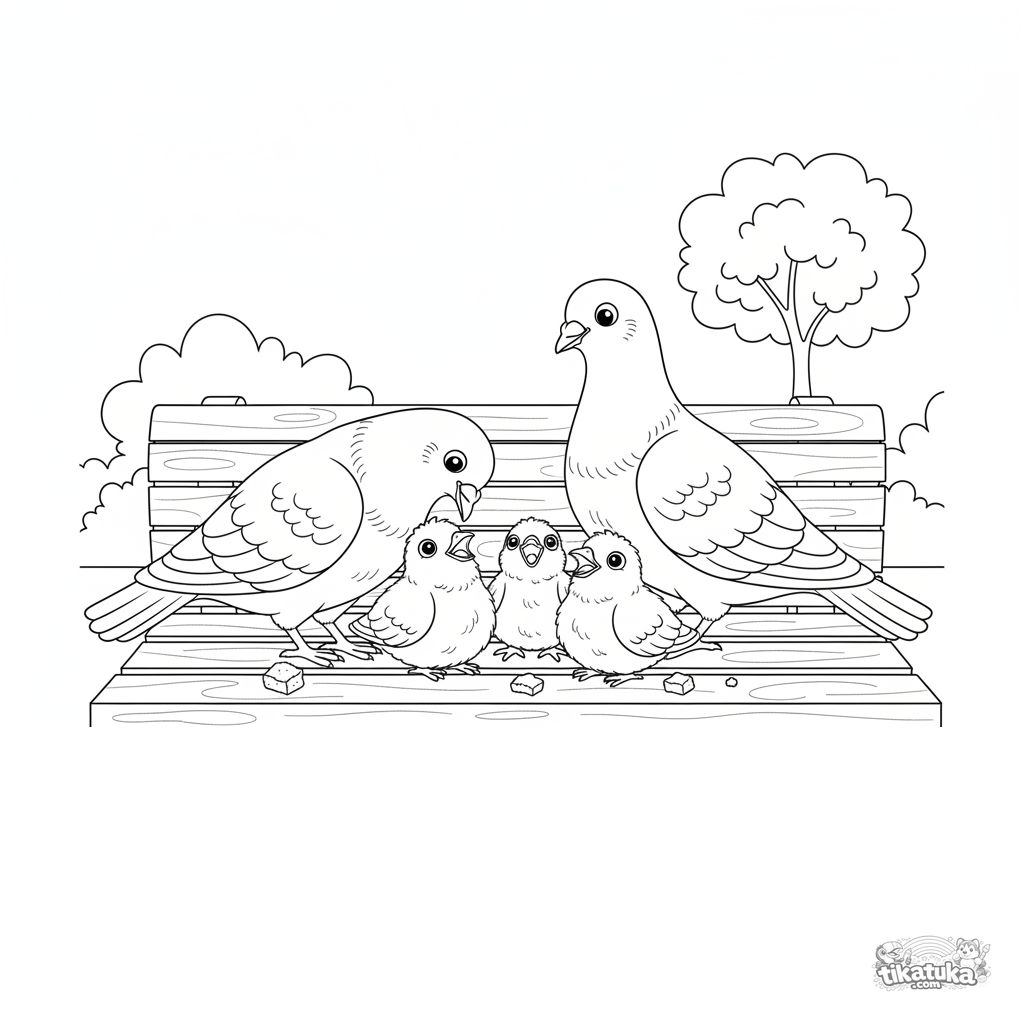 Раскраска для детей 7-9 лет: реалистичное изображение семьи голубей на скамейке в парке. Взрослые птицы заботятся о своих пушистых птенцах.