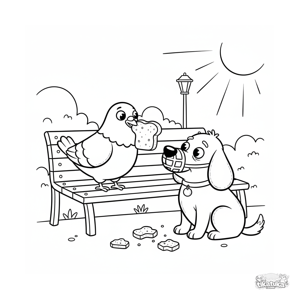 Раскраска для детей 4-6 лет: голубь кормит хлебом пожилую собаку у скамейки в парке. Трогательная сцена о дружбе и доброте.