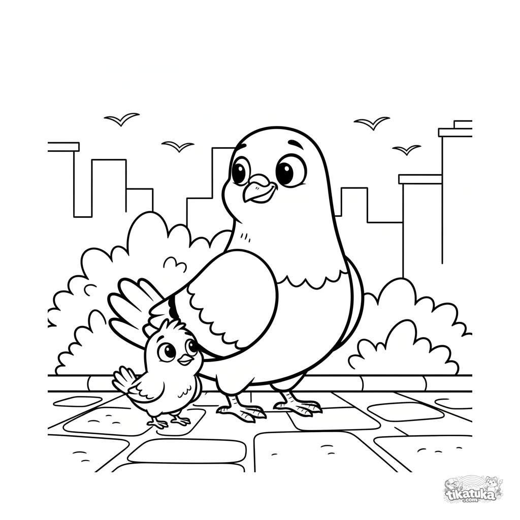 Раскраска для детей: заботливый городской голубь ведёт за собой маленького потерявшегося птенца по дорожке парка. Трогательная сцена защиты и помощи.