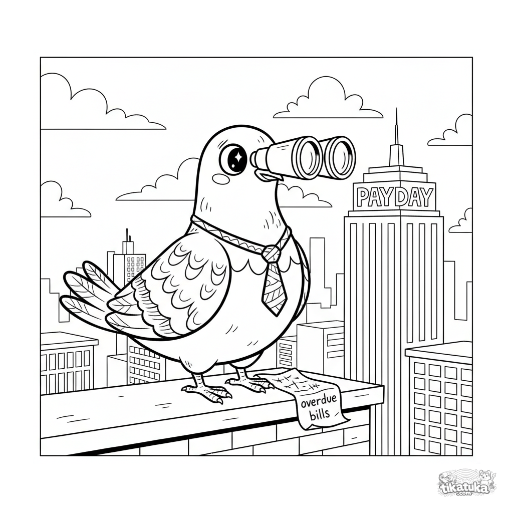 Раскраска для детей 10-12 лет: забавный голубь в галстуке с биноклем на крыше офиса высматривает свою зарплату. Смешной мем-сюжет с деталями для раскрашивания.