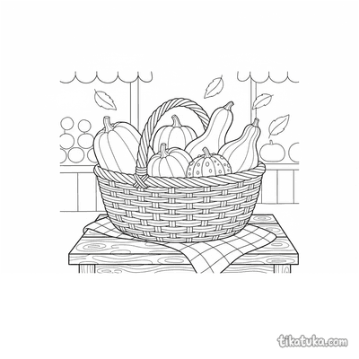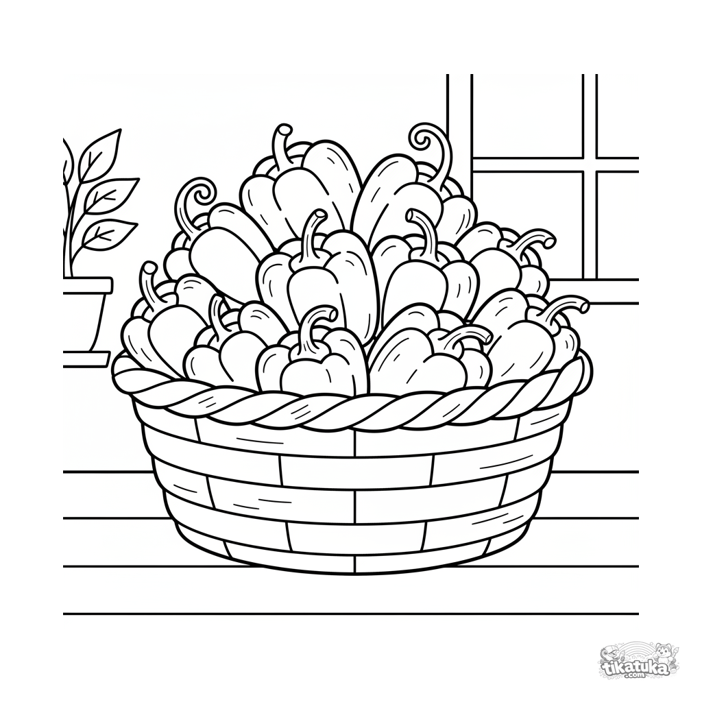 Раскраска в стиле линогравюры: корзина, полная разноцветных перцев. Для детей 7-9 лет. Чёткие контуры, перекрывающиеся формы, ощущение изобилия.