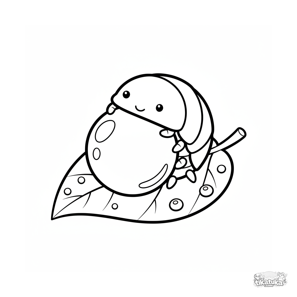 Простая раскраска для малышей 2-3 лет: мокрица играет с каплей росы как с шариком на большом листе. Очень простые формы, крупный персонаж.