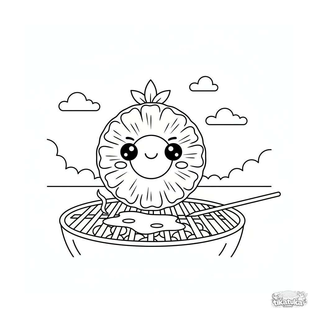 Раскраска для детей 4-6 лет: колечко ананаса в шляпке из листа балансирует на ребре на гриле. Чёткие контуры, геометрический стиль.