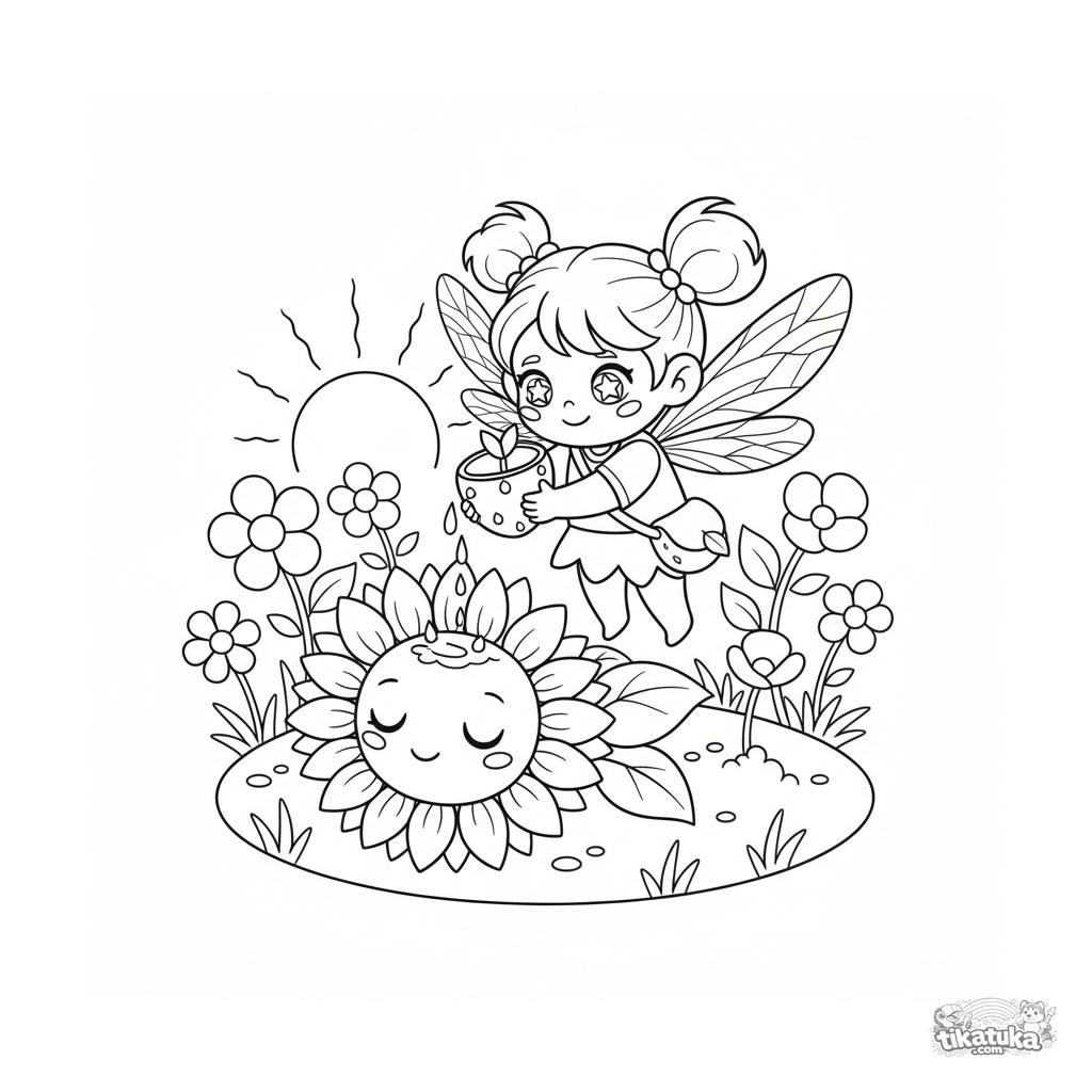 Раскраска для детей 7-9 лет: маленькая пикси с крыльями стрекозы доставляет утреннюю росу спящим цветам в саду на рассвете. Милая сцена в стиле чиби.