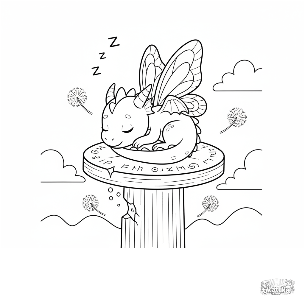 Раскраска для детей 4-6 лет: крошечный дракончик-пикси сладко спит на круглом руническом камне. Мягкие, плавные линии, умиротворенное настроение, понятные формы.