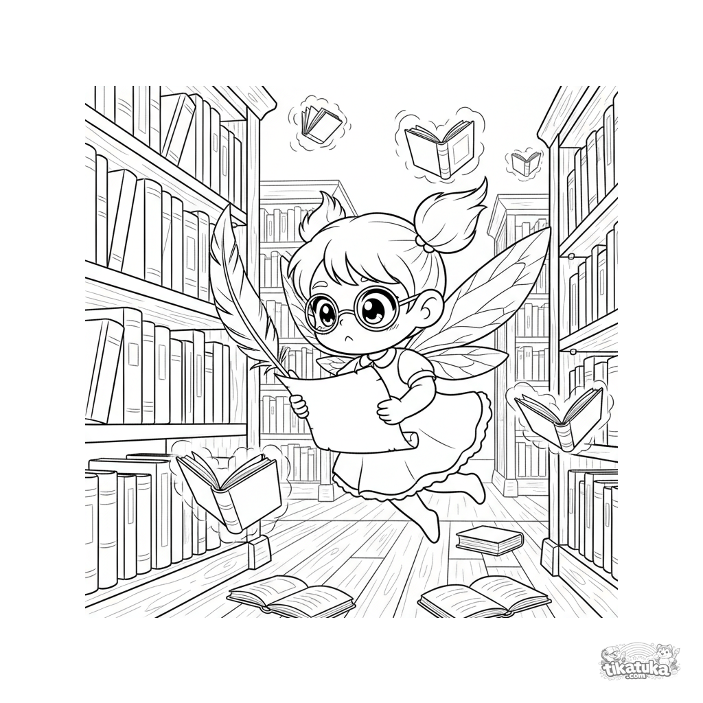 Раскраска для детей 7-9 лет: крошечная пикси-библиотекарь сортирует светящиеся книги в волшебной библиотеке. Фэнтези-сцена с деталями для раскрашивания.