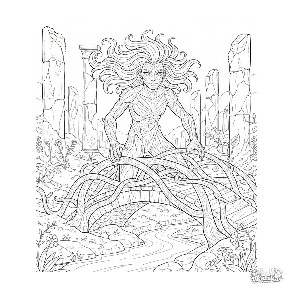 Раскраска с растительным супергероем, создающим мост из лиан в древних лесных руинах. Для детей 10-12 лет, детализированная и атмосферная сцена.