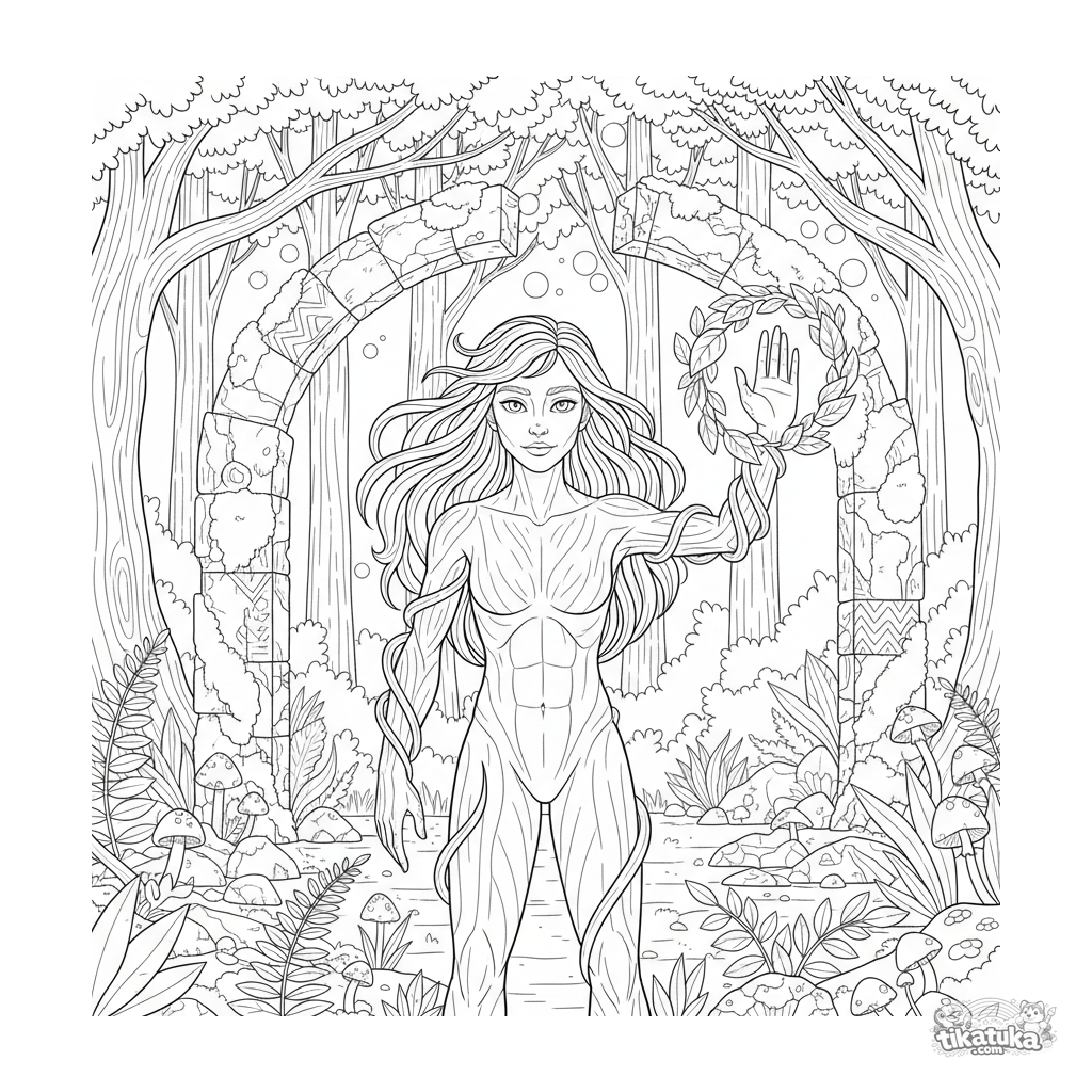 Раскраска для детей 10-12 лет: супергерой с силами растений защищает древние руины в волшебном лесу. Детализированная сцена с природными элементами.