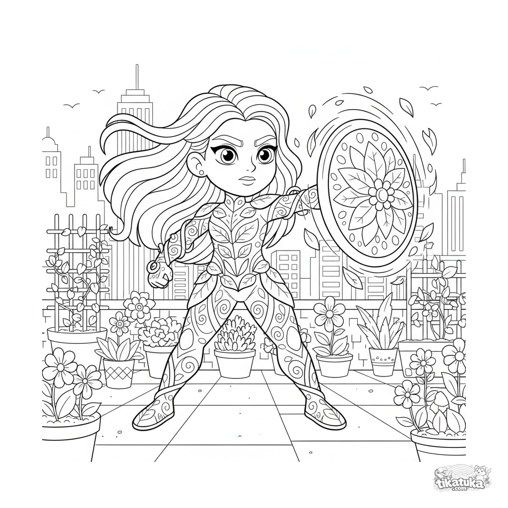 Раскраска для детей 10-12 лет: супергерой с силами растений создаёт щит из листьев и цветов на крыше городского сада, решительное выражение лица.