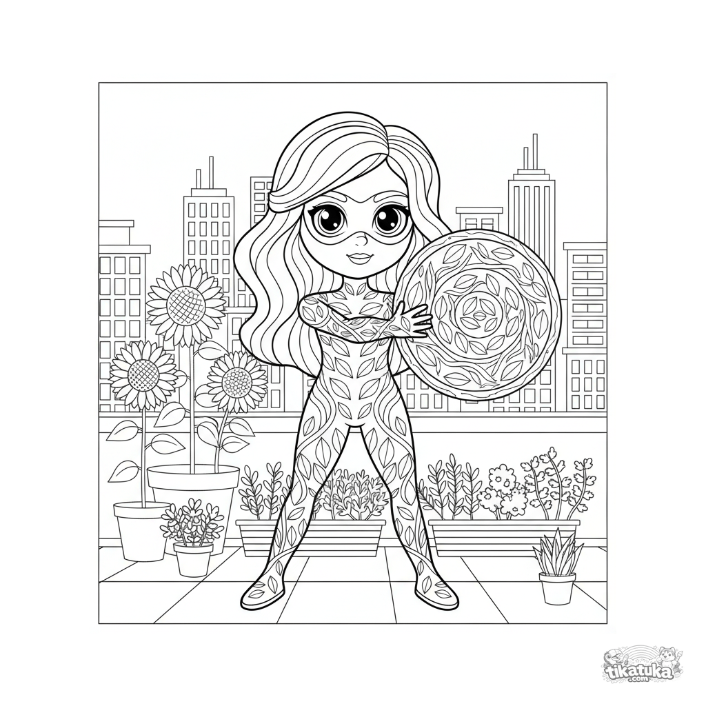 Раскраска с растительным супергероем, создающим щит из листьев на городской крыше-саду. Для детей 10-12 лет. Детализированная сцена с городским пейзажем.