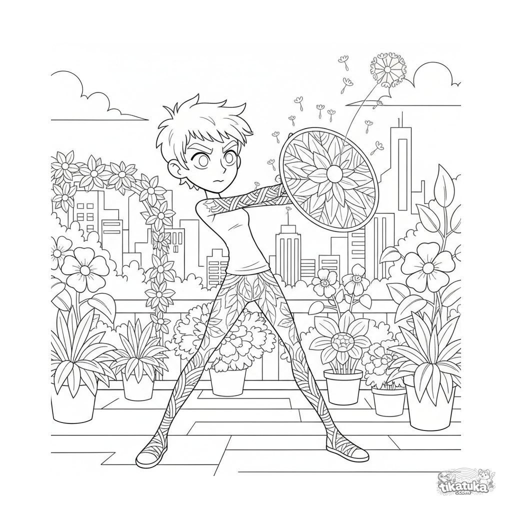Раскраска для детей 10-12 лет: подросток-супергерой с силами растений создаёт щит из листьев в саду на городской крыше.