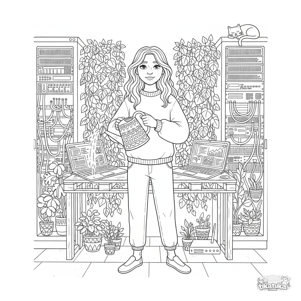 Раскраска для детей 10-12 лет: хакер ухаживает за вертикальным садом среди серверных стоек в подвале, создавая уютное зеленое пространство для работы и отдыха.