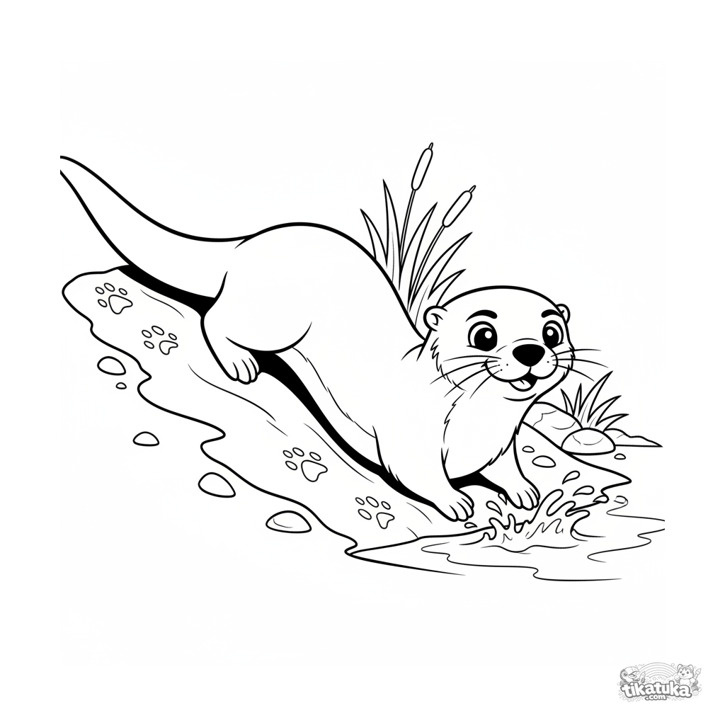 Раскраска для детей 4-6 лет: весёлая выдра скатывается с грязного берега в ручей. Динамичная поза, брызги воды, комический приключенческий стиль.