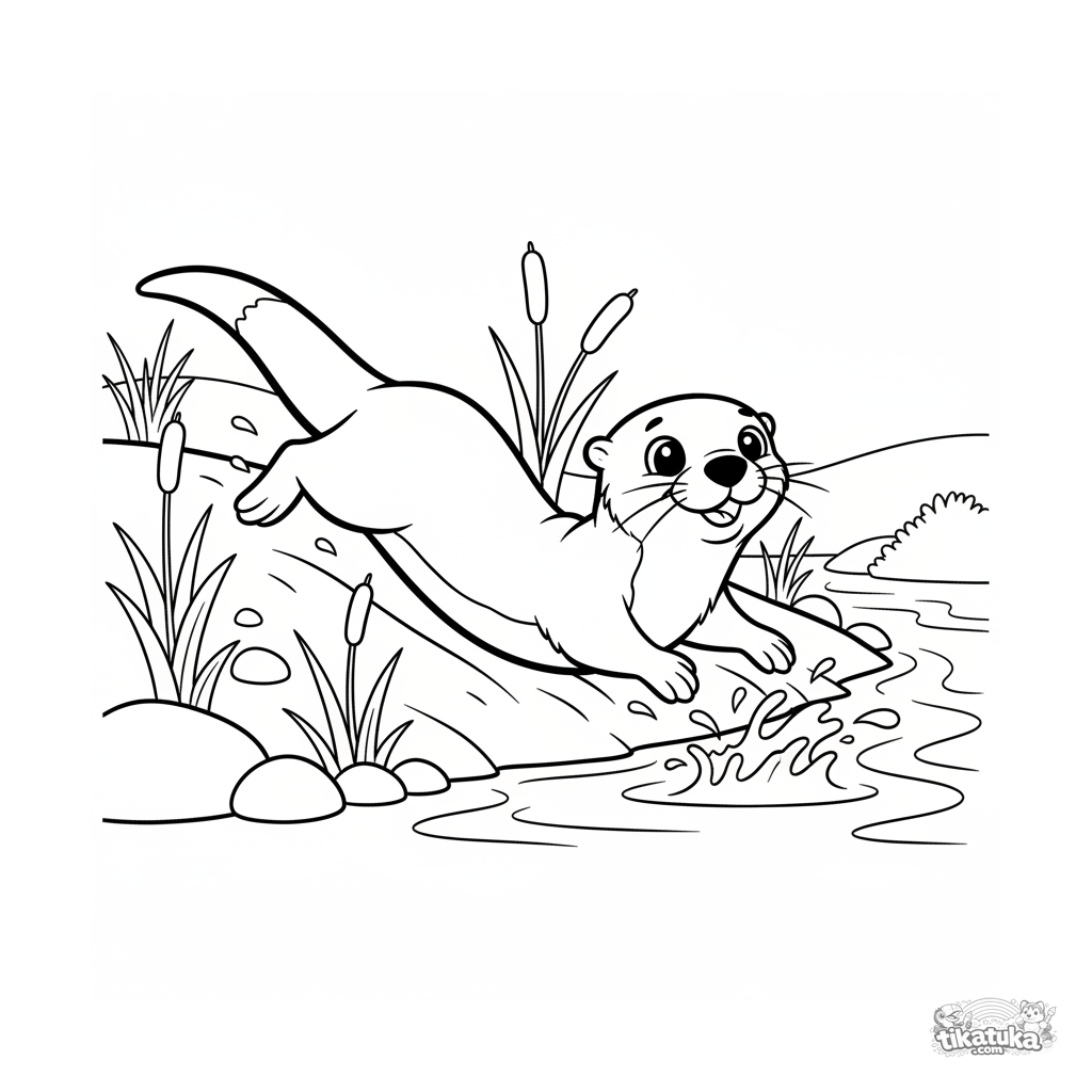 Раскраска для детей 7-9 лет: игривая выдра весело скатывается с грязного берега в прозрачный ручей. Динамичная поза, брызги, камыши.
