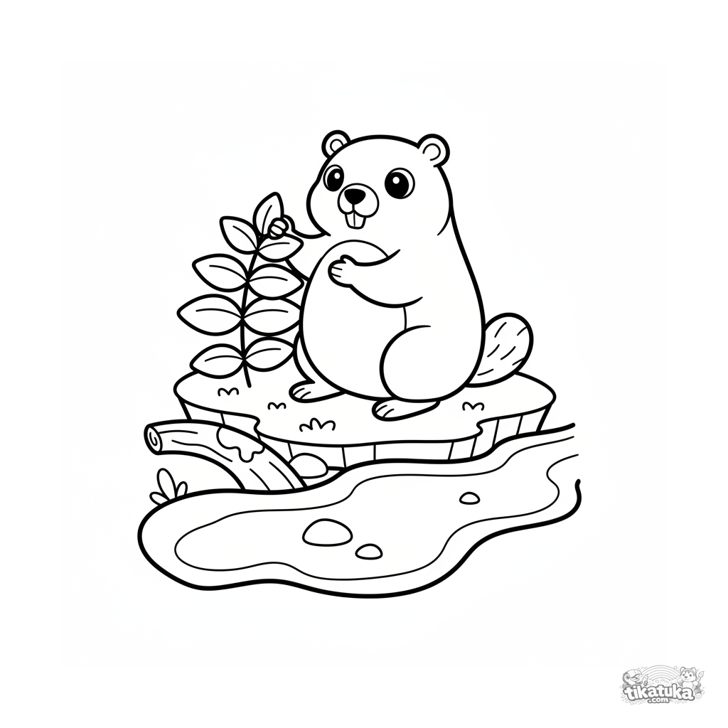 Раскраска для малышей: пухлый сурок с любопытным носом стоит на берегу прозрачного ручья, обнюхивая дикую мяту. Простые формы, широкие поля.