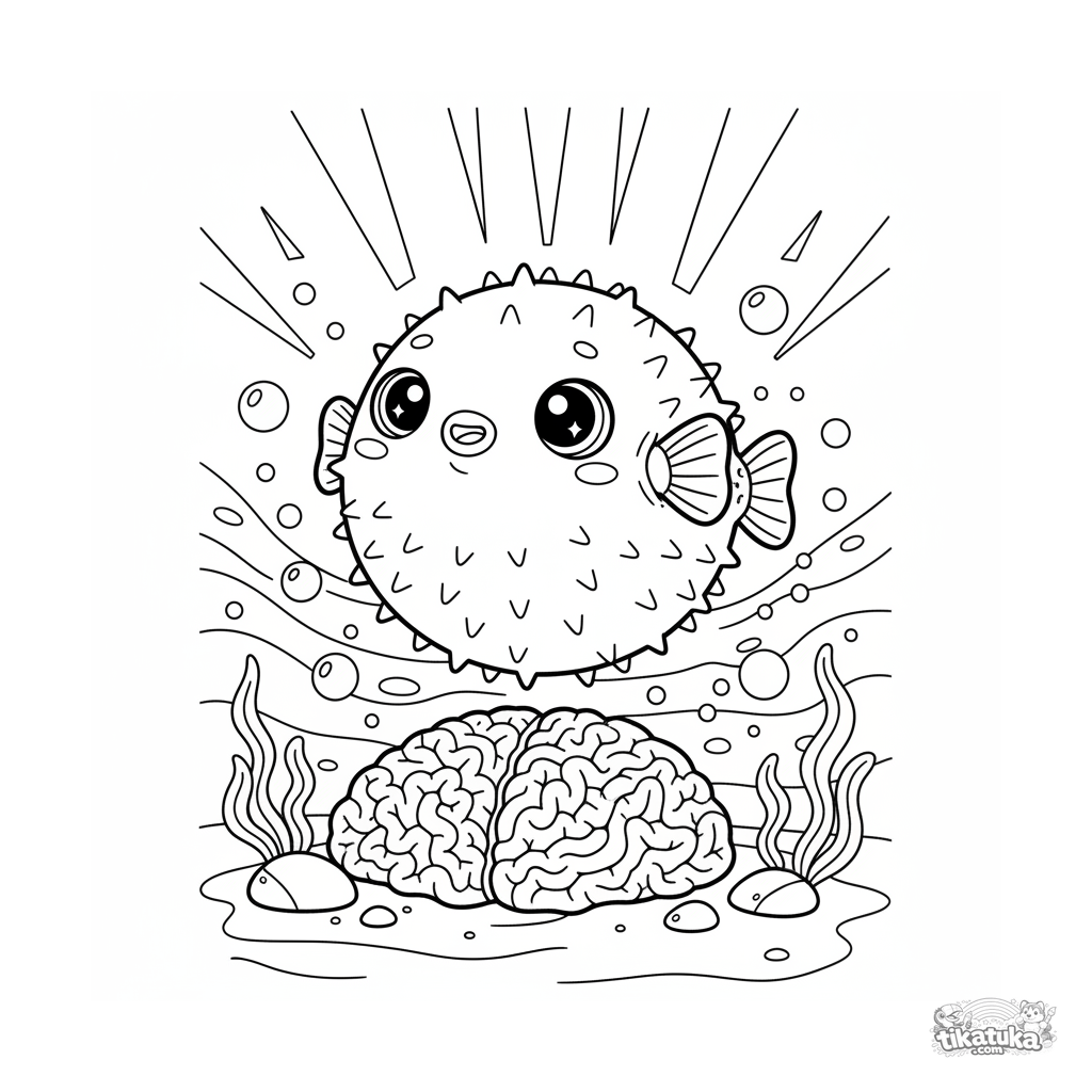Раскраска с забавным иглобрюхом, который надувается у коралла в солнечных лучах на мелководье. Для детей 7-9 лет. Динамичная поза, выразительные глаза.