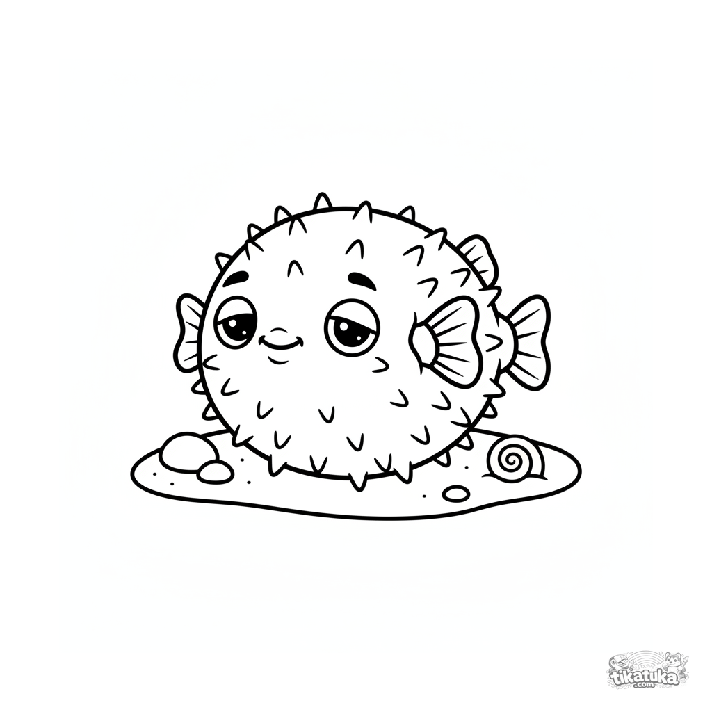 Простая раскраска для малышей 2-3 лет: круглый иглобрюх отдыхает на теплом песке в лучах солнца. Крупные простые формы идеальны для первых карандашей.