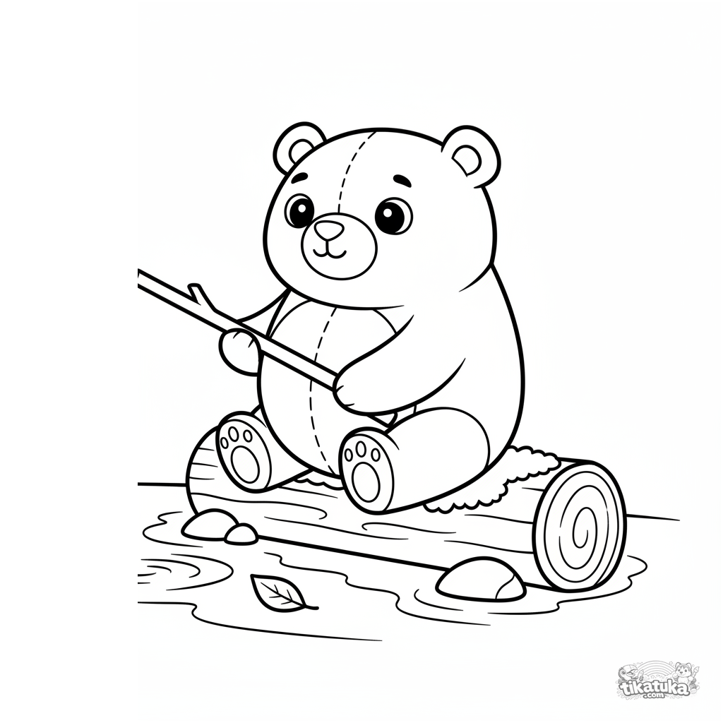 Простая раскраска для малышей 2-3 лет: плюшевый мишка сидит на бревне у ручья и пытается поймать рыбу на палочку, большие формы.