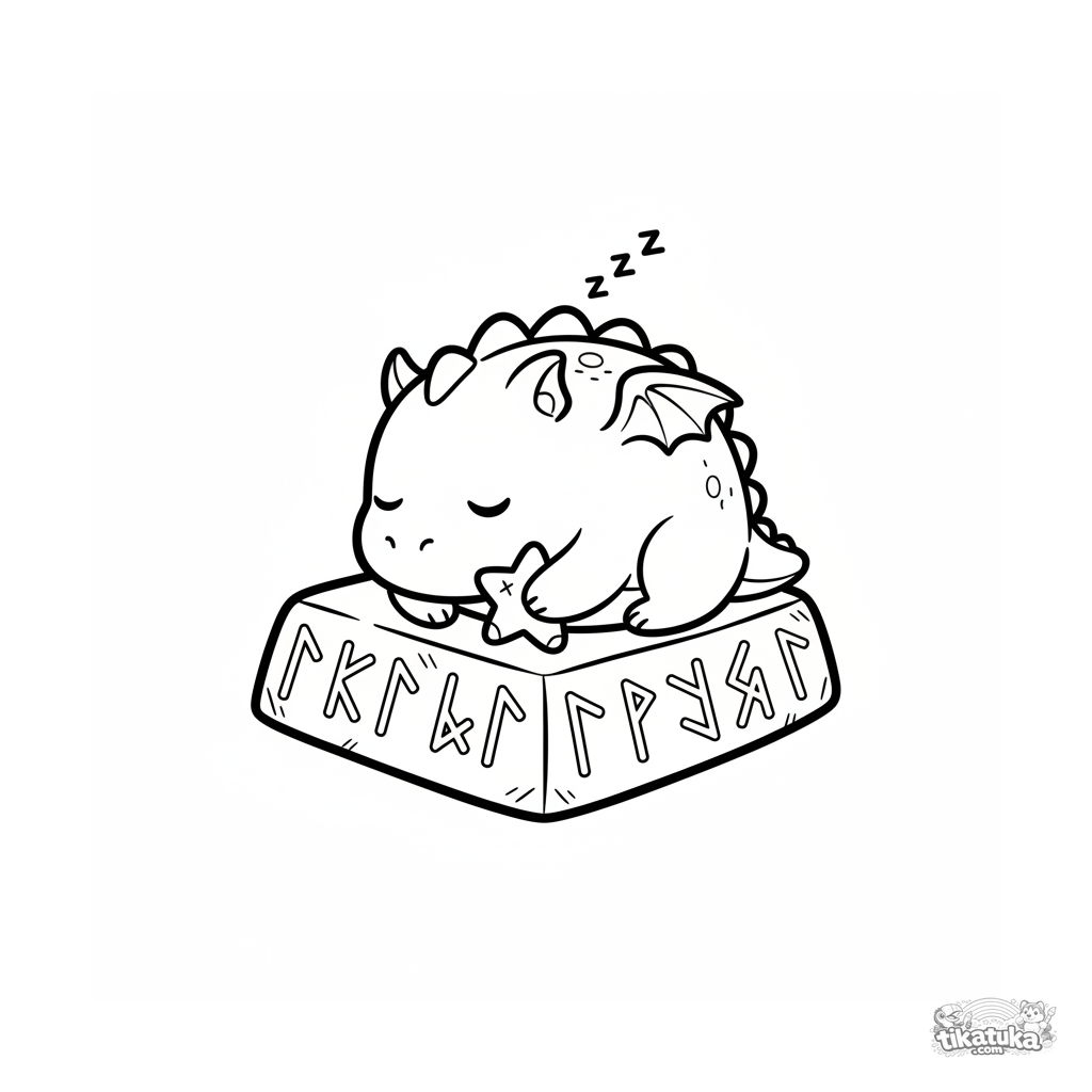 Простая раскраска для малышей 2-3 лет: плюшевый дракончик сладко спит на большом руническом камне. Крупные закрытые формы, очень мало внутренних линий.