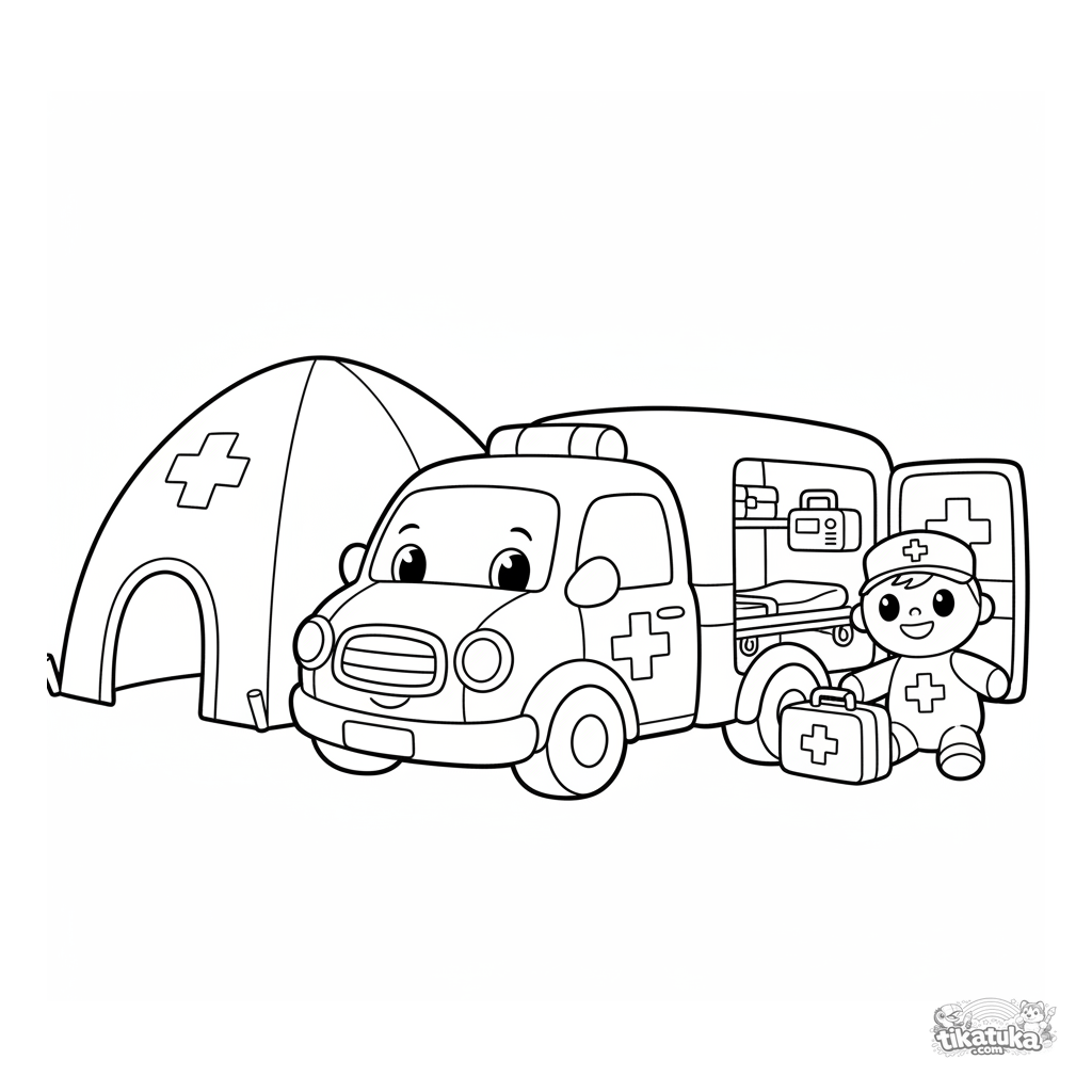 Раскраска для малышей 2-3 года: добрая плюшевая машина скорой помощи у медицинской палатки. Простые формы и широкие поля для раскрашивания.