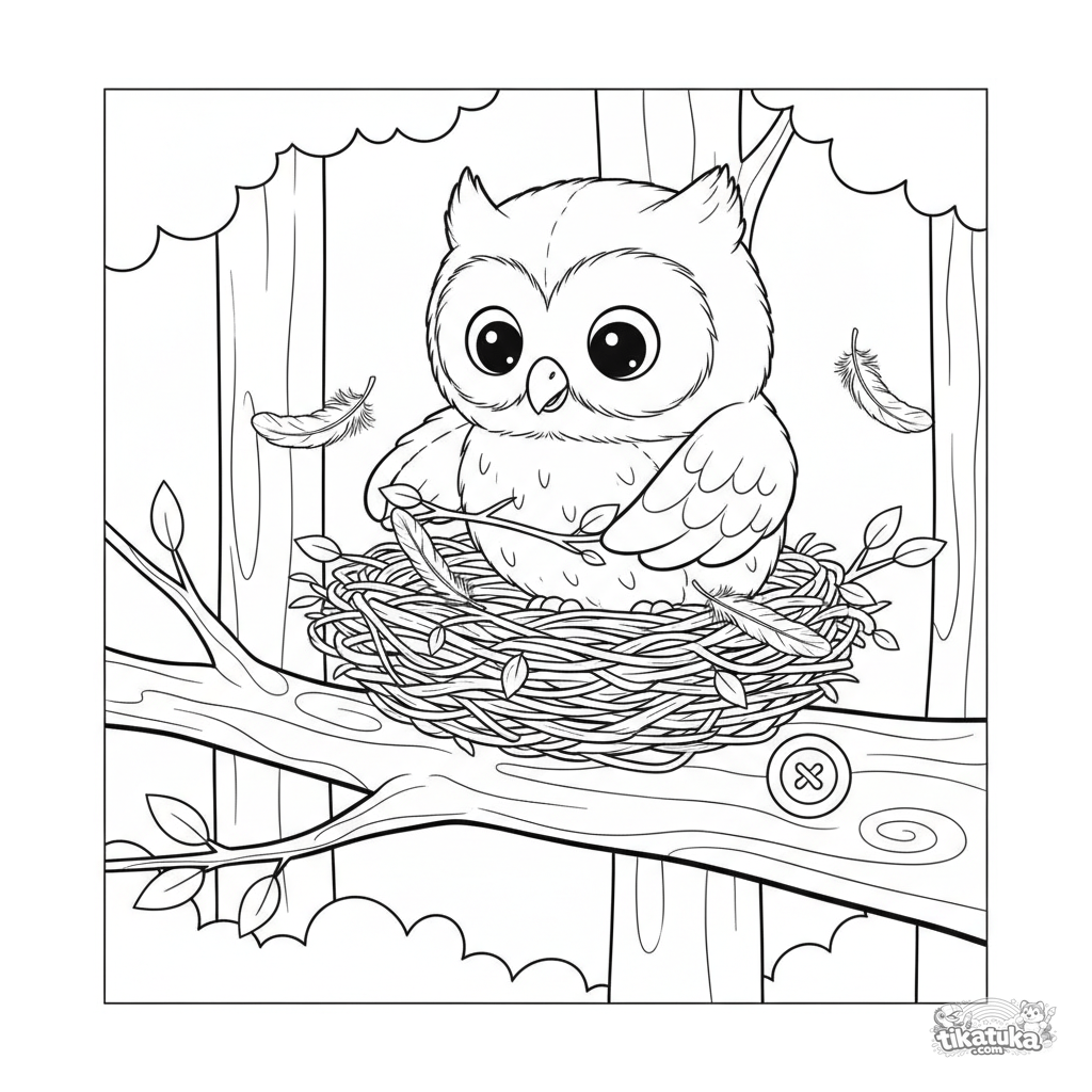 Раскраска для детей: милая плюшевая сова помогает наводить порядок в гнезде на лесной ветке. Добрый сюжет для развития воображения.