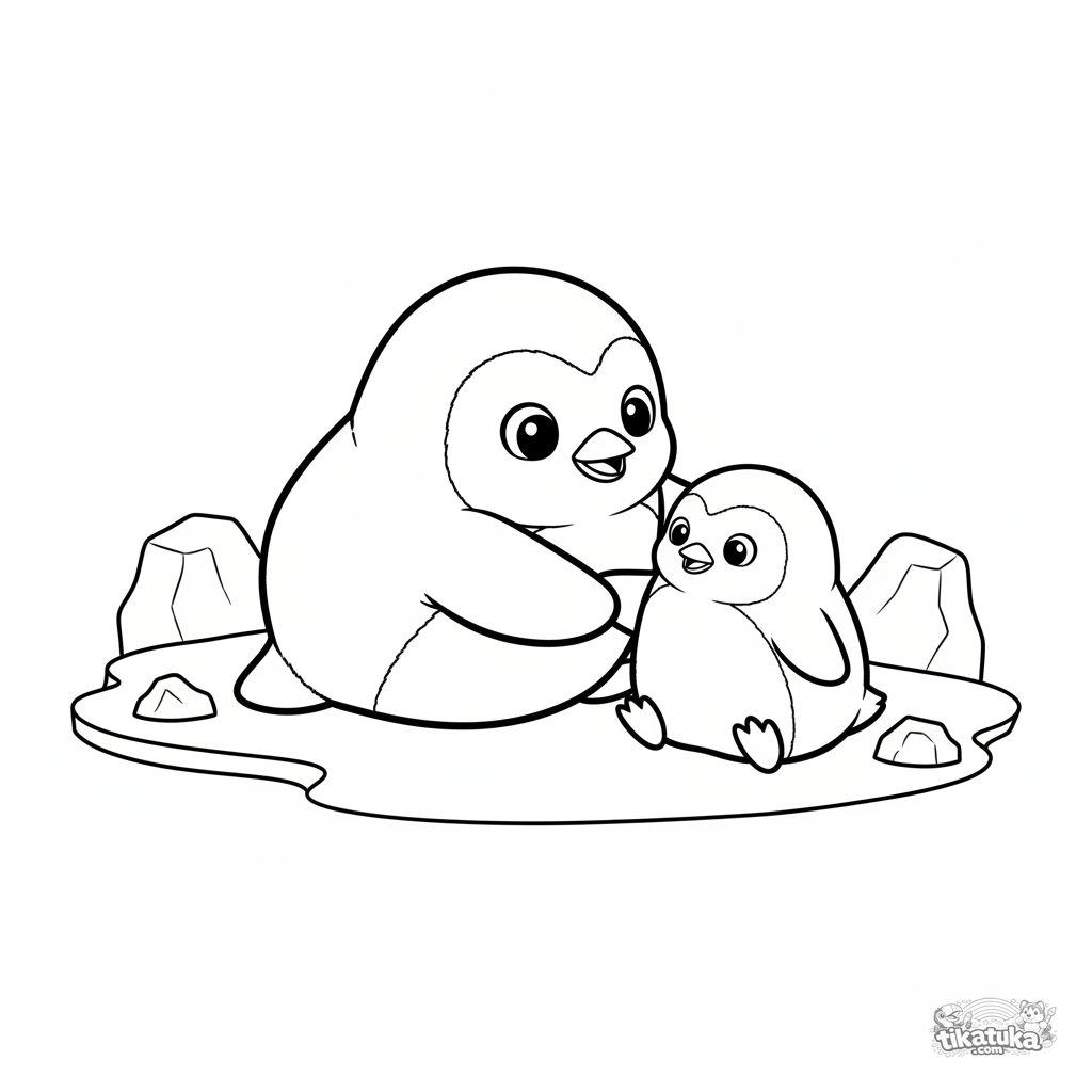 Раскраска для детей: милый плюшевый пингвин помогает своему другу встать на льду. Теплая сцена о дружбе и взаимопомощи.