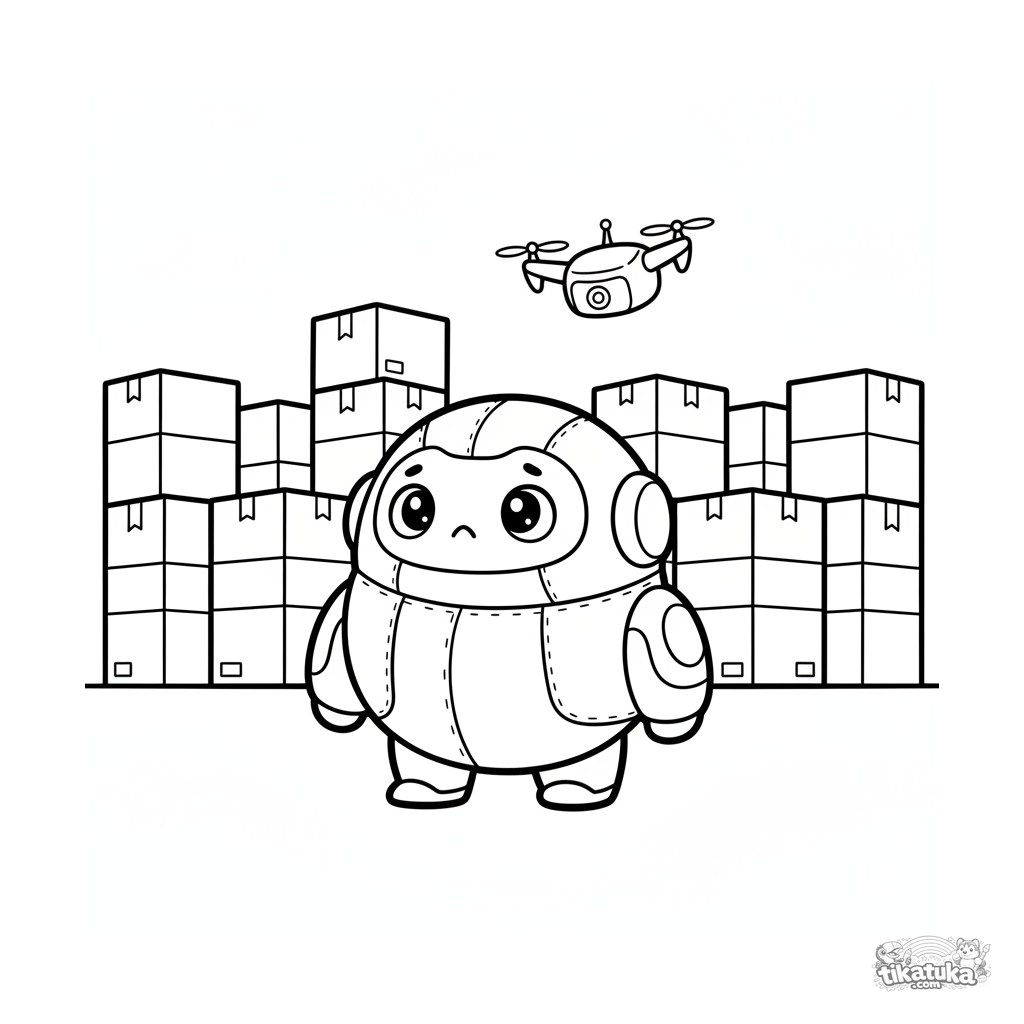 Простая раскраска для самых маленьких: милый плюшевый робот выглядит растерянным среди коробок на складе. Крупные, мягкие формы, идеально для малышей 2-3 лет.