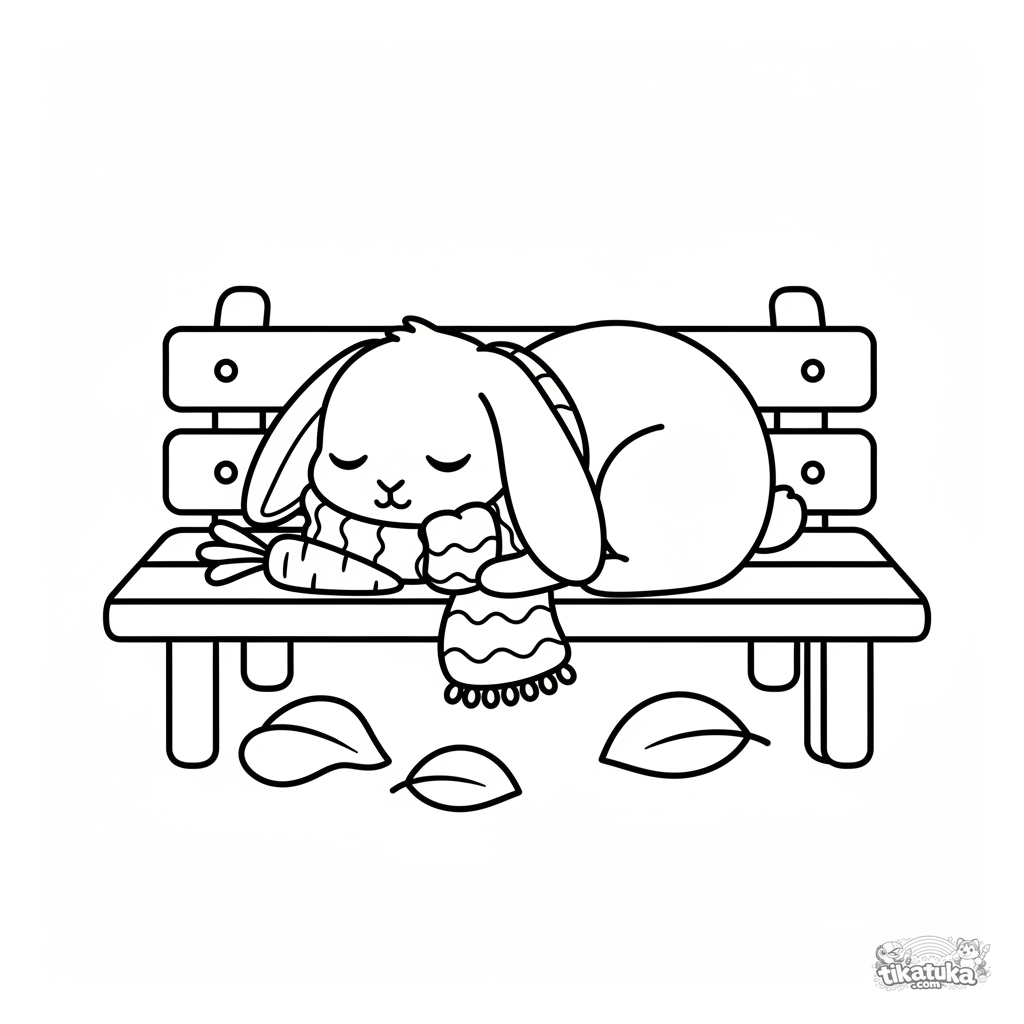 Простая раскраска для малышей 2-3 лет: милый плюшевый кролик спит на скамейке в парке. Крупные формы, мало деталей, широкие поля для раскрашивания.