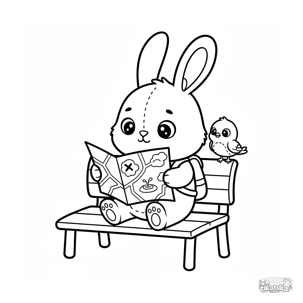 Простая раскраска для малышей 2-3 лет: плюшевый кролик сидит на скамейке в парке и изучает большую карту. Крупные формы, широкие поля.
