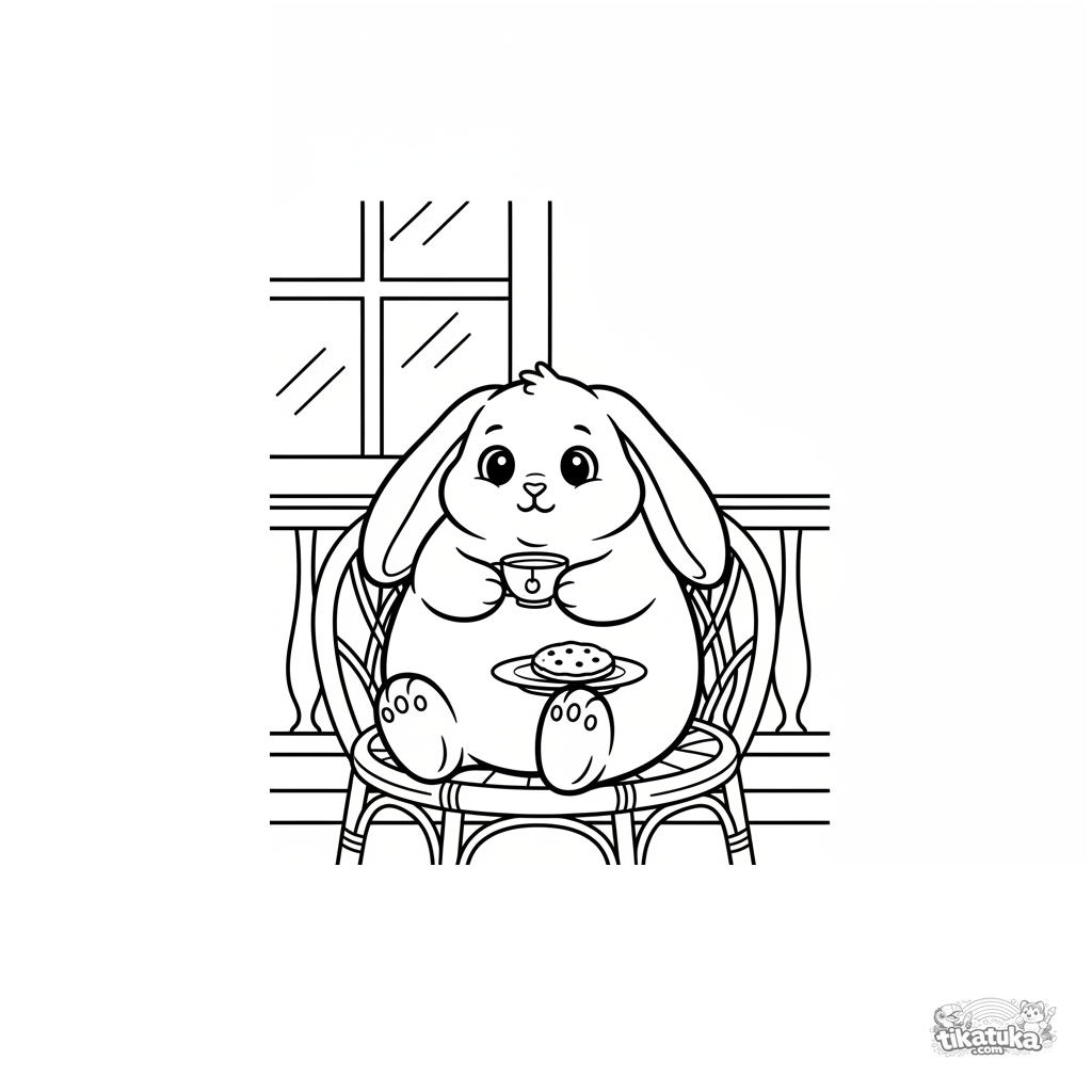Раскраска для малышей: плюшевый кролик на летней веранде держит чашку. Простые крупные формы, широкие поля для раскрашивания.