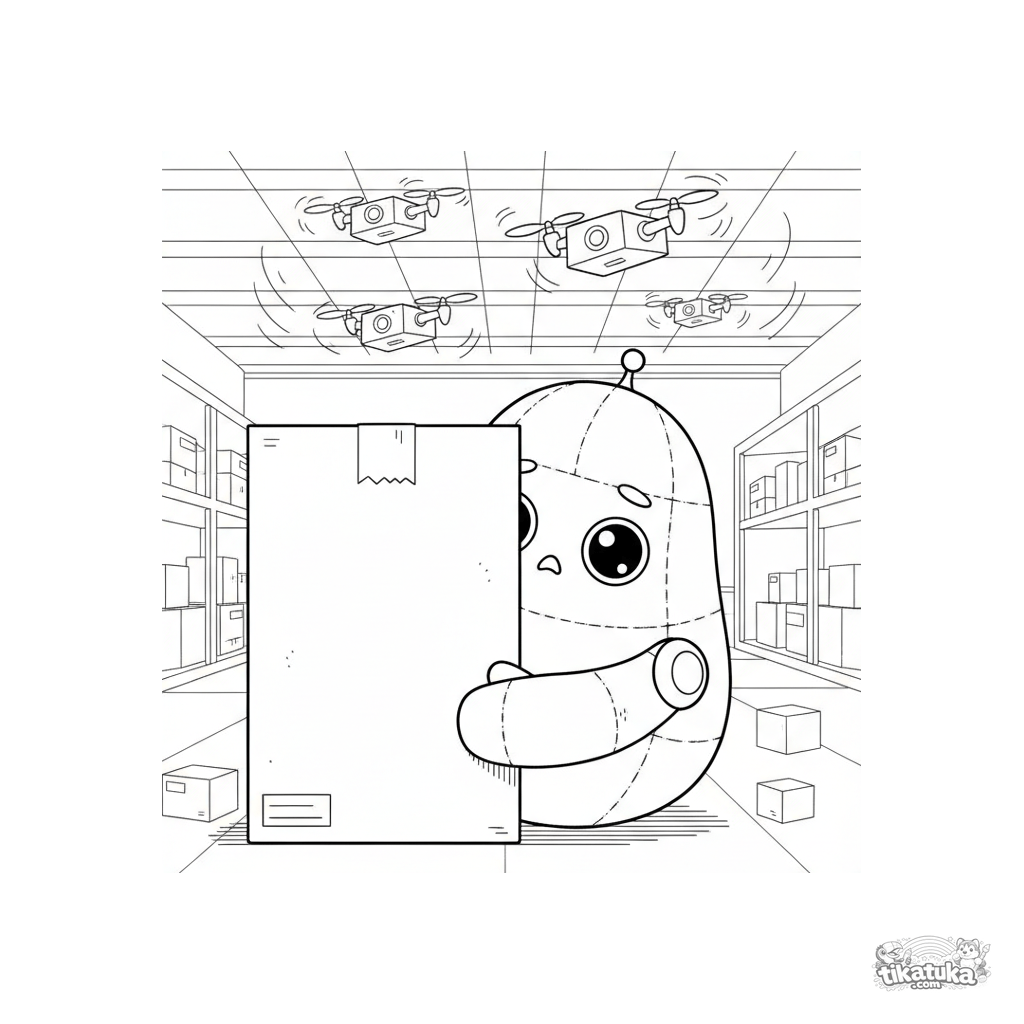 Раскраска для детей 4-6 лет: милый плюшевый робот со швами и пуговицами-глазами робко выглядывает из-за огромной коробки на складе, наблюдая за пролетающими мимо дронами.