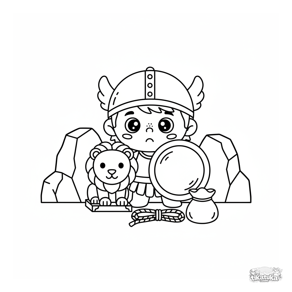 Простая раскраска для малышей 2-3 года: плюшевый Персей прячется за статуей в логове Горгоны. Крупные формы, толстые контуры, идеально для первых карандашей.